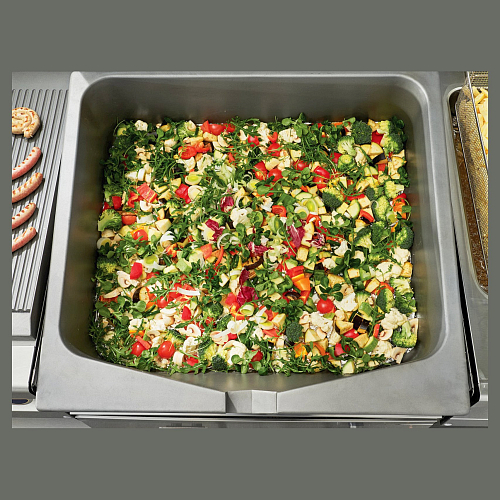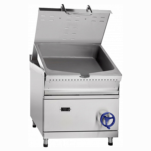 Сковорода имеет плавную регулировку температуры жарочной поверхности в диапазоне 100-340 С. Нагрев осуществляется горелкой, равномерно распределяющей тепло по поверхности чаши. Дно чаши толщиной 10 мм позволяет надежно удерживать тепло в режиме приготовления. Сковорода снабжена механизмом подъема и опускания чаши, что обеспечивает удобство очистки и обслуживания сковороды. Крышка предотвращает потерю тепла и фиксируется в любом положении. Боковая и задняя обшивки изготовлены из крашенного оцинкованного металла. Сковорода имеет регулируемые по высоте ножки.