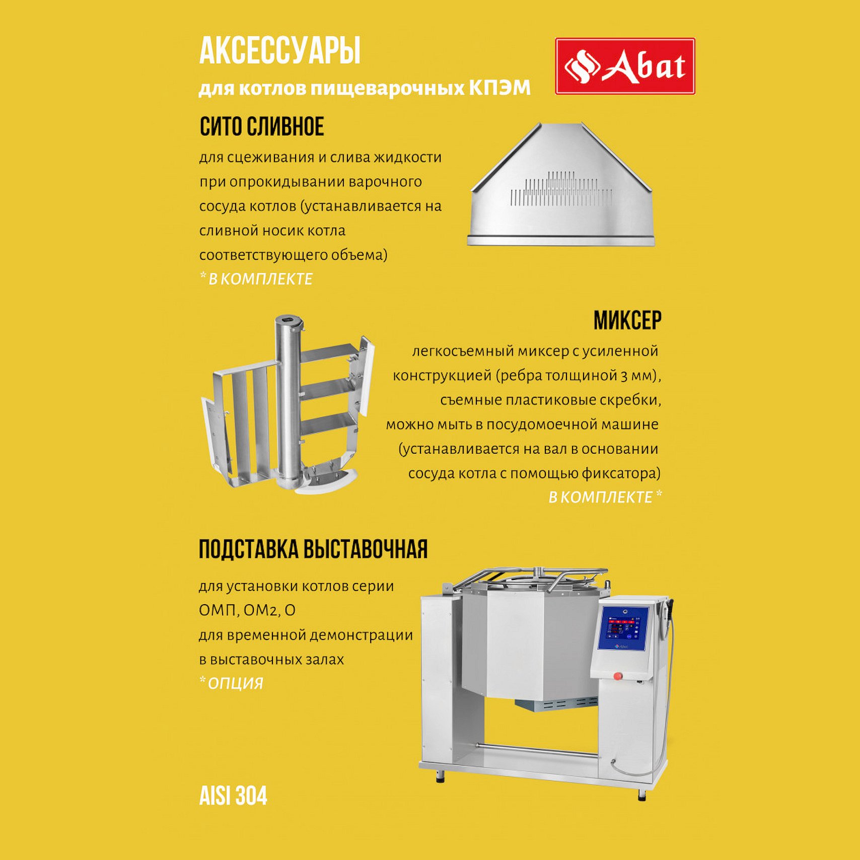 Котел пищеварочный электрический Abat (Чувашторгтехника) КПЭМ-160-ОМ2 (со сливным краном) с функциями опрокидывания, перемешивания и охлаждения, предназначен для приготовления бульонов, соусов, десертов, вторых и третьих блюд на предприятиях общепита.
