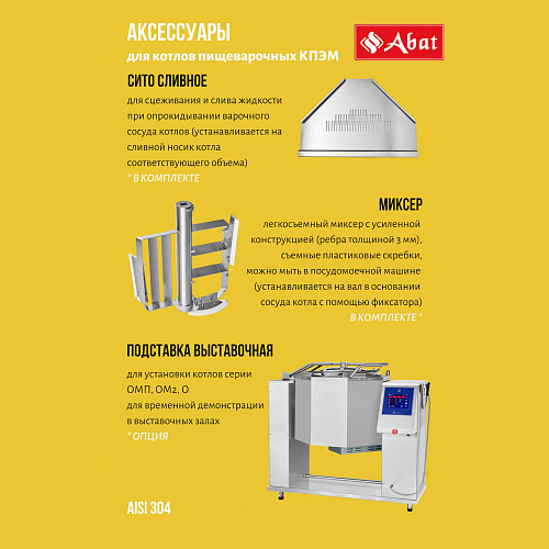 Котел пищеварочный электрический Abat (Чувашторгтехника) КПЭМ-350-ОМП (со сливным краном) с функциями опрокидывания, перемешивания и охлаждения предназначен для приготовления бульонов, соусов, десертов, вторых и третьих блюд на предприятиях общепита.