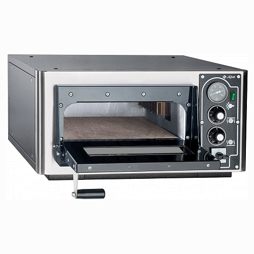 Камера вмещает одну пиццу размером 35 сантиметров. Температуру нагревательных элементов можно задавать отдельными терморегуляторами, на понятной механической панели управления. Диапазон рабочих температур печи составляет от 20 до 450 C, установленная аварийная тепловая защита предохранит оборудование от перегрева более 500 C. Облицовка выполнена из окрашенного металла, дверь и рама покрыты эмалью, а камера изготовлена из оцинкованного листа толщиной 1,5 мм. Рукоять закрепленная на дверце, не нагревается, поэтому работать с печью для пиццы удобно и просто.
