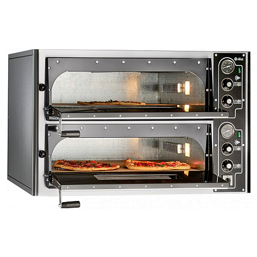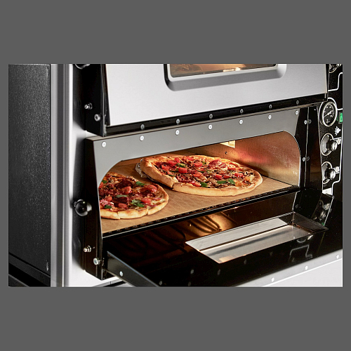 Вместительность одной камеры – четыре заготовки для пиццы диаметром 350 мм. Конструкцией данной модели предусмотрено наличие двух рабочих камер, вместимость которых позволяет обеспечивать одновременное приготовление восьми пицц, диаметр не должен быть более трёхсот пятидесяти миллиметров. В рабочих камере данной печи для пиццы как сверху, так и снизу размещаются раздельно регулируемые нагревательные элементы. Кроме того, при нагревании данной внутреннего пространства рабочей камеры до 500С и более срабатывает аварийный термовыключатель, позволяющий уберечь оборудование от перегрева.