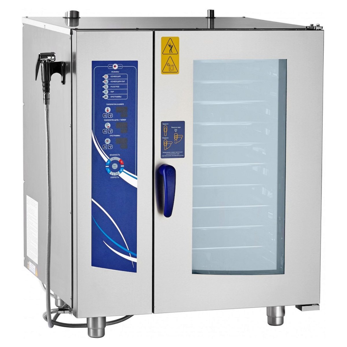 Внутрикамерная подсветка и дверь с двойным остеклением позволяет контролировать процесс, парогенератор для образования пара и легкосъемный жировой фильтр, душ для мойки, печь можно мыть изнутри под струей воды. Двухходовой механизм открывания духовки и вентилируемая дверь, предотвращает риск получения ожога рук с внешней стороны. Механизм замка двери действует по принципу "свободные руки" - для простого закрывания двери одним движением, обеспечивает безопасность персонала от воздействия горячего пара.