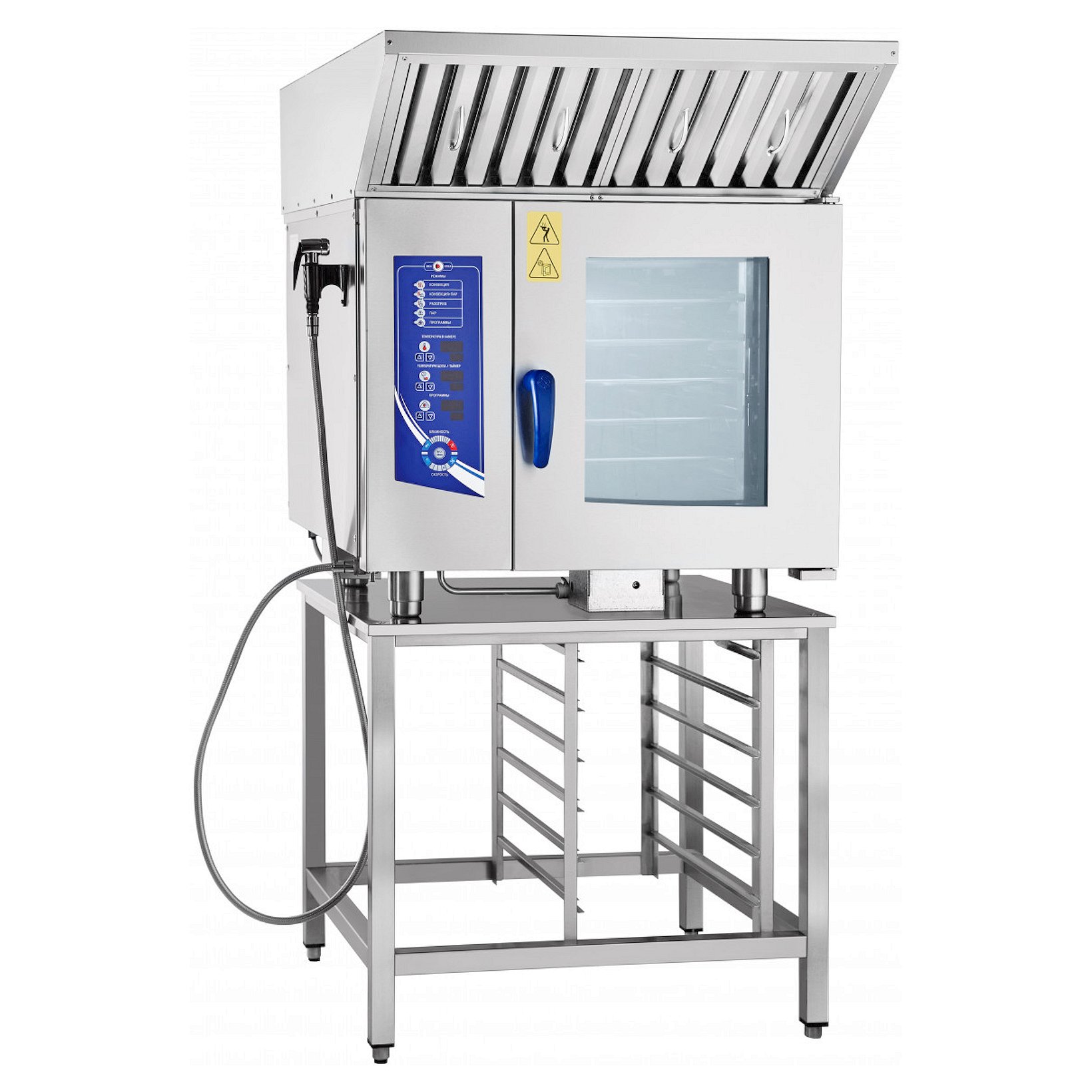 Внутрикамерная подсветка и дверь с двойным остеклением позволяет контролировать процесс приготовления блюд, удобная панель управления, легкосъемный жировой фильтр. Двухходовой механизм открывания духовки и вентилируемая дверь, предотвращает риск получения ожога рук с внешней стороны. Механизм замка двери действует по принципу "свободные руки" - дверь можно закрывать одним движением руки, тем самым обеспечивая безопасность персонала от воздействия горячего пара.