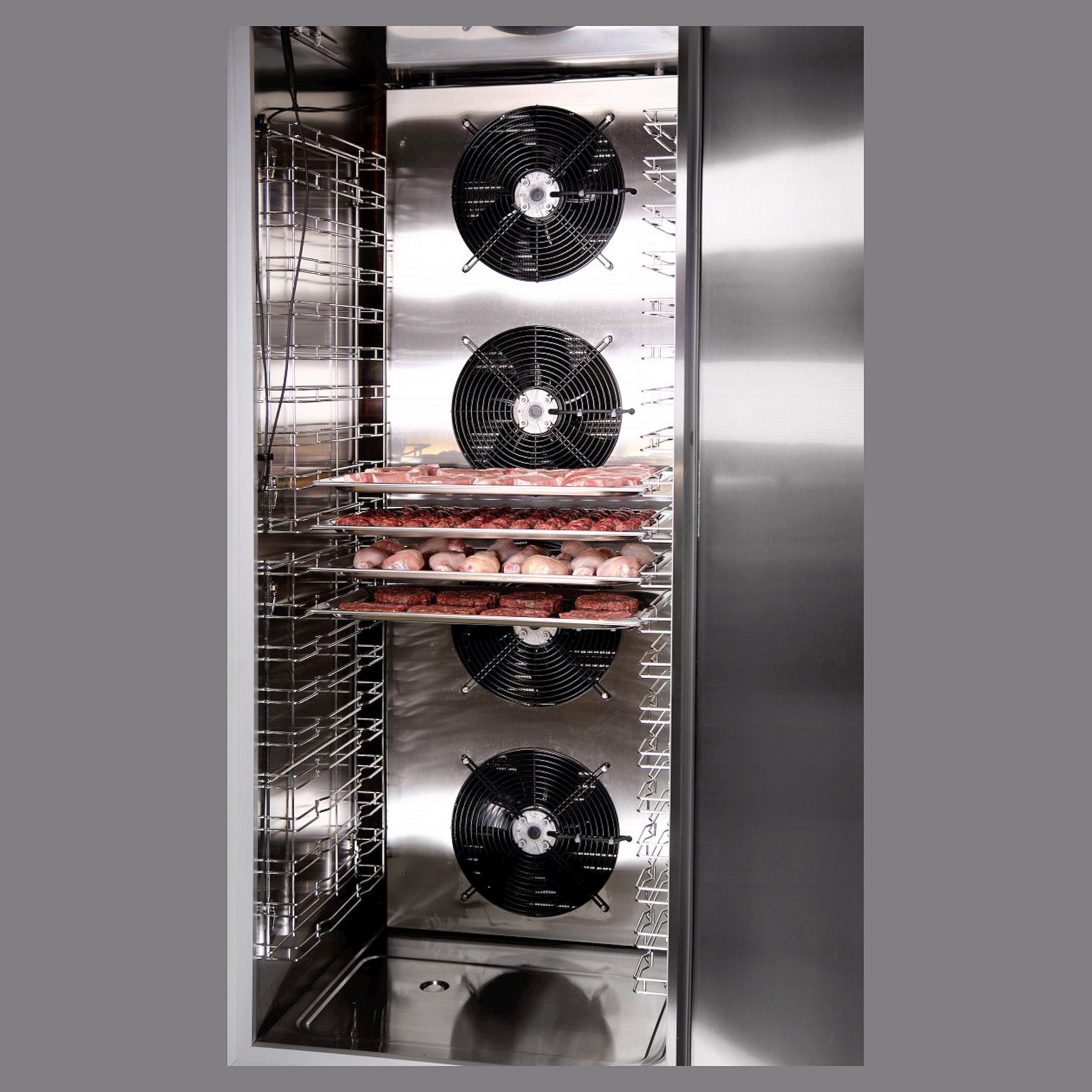 Для постоянного измерения температуры в шкафе шокового охлаждения установлены термочувствительные датчики, которые закрепляются на крышке воздухоохладителя и на термощупе, вставляемом в продукт. При достижении заданной температуры компрессор отключается, при повышении температуры больше установленной - автоматически начинает работать. Кроме того, аппарат шоковой заморозки оснащен режимом автоматический и принудительной оттайки, что существенно повышает удобство его эксплуатации.