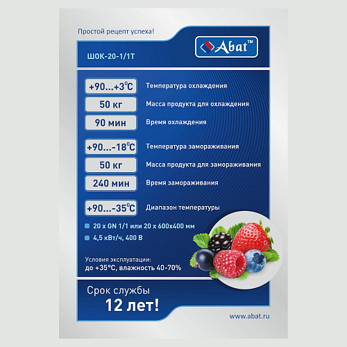 Шкаф шоковой заморозки Abat ШОК-20-1/1Т предназначен для быстрого охлаждения, замораживания и дальнейшего хранения различных пищевых продуктов на предприятиях общественного питания и торговли.