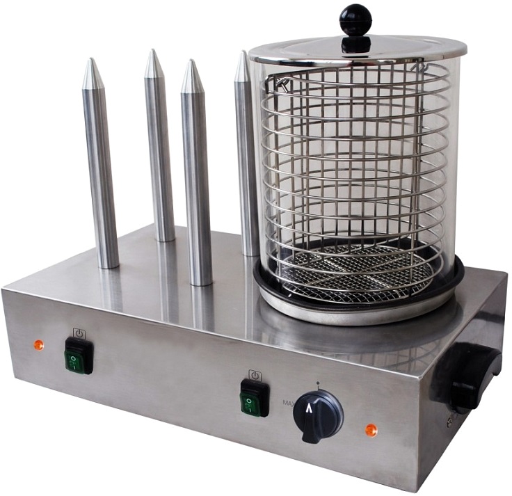 Аппарат для хот-дога Airhot HDS-04 оснащен стеклянной ёмкостью для приготовления сосисок и тремя штырями для подогрева булочек. Подходит для предприятий общественного питания и уличных точек.