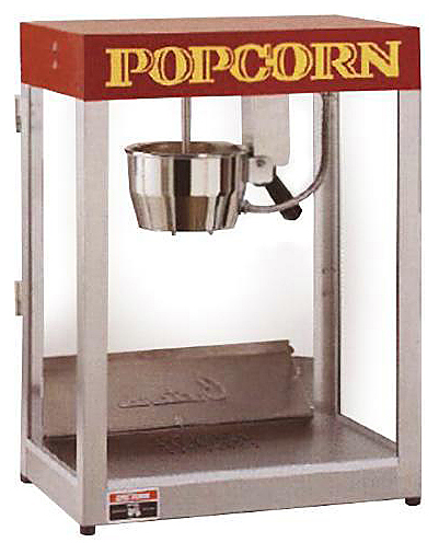 Аппарат настольный Cretors Gold Rush 06oz для производства соленого  попкорна имеет красный верх, раму из нержавеющей стали, лампу внутренней подсветки, ТЭН для подогрева готовой продукции в основании и никелированный стальной котел.