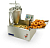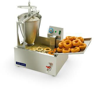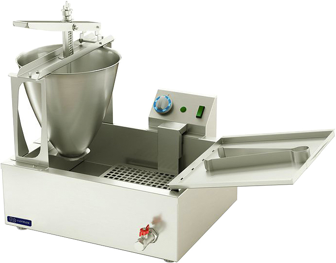 Модель состоит из фритюрной ванны, ручного дозатора, блока управления с электронагревателем и поддона для выкладки пончиков со специальными отверстиями для стекания излишков масла. Все части аппарата выполнены из пищевой нержавеющей стали AISI 430.