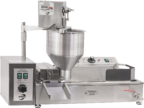 Аппарат формирует и отсаживает по одному пончику в ручей. Ванна имеет кольцевое движение фритюра. Переворот и выгрузка пончиков осуществляется автоматически. В стандартной комплектации пончиковый аппарат оснащен плунжерной парой, позволяющей изготавливать пончики диаметром 80-85 мм (плунжерные пары другого диаметра поставляются отдельно). Время разогрева не более 25 минут.