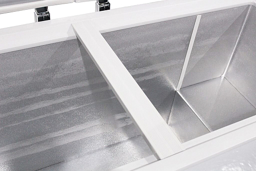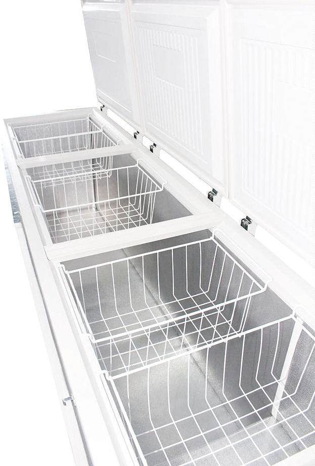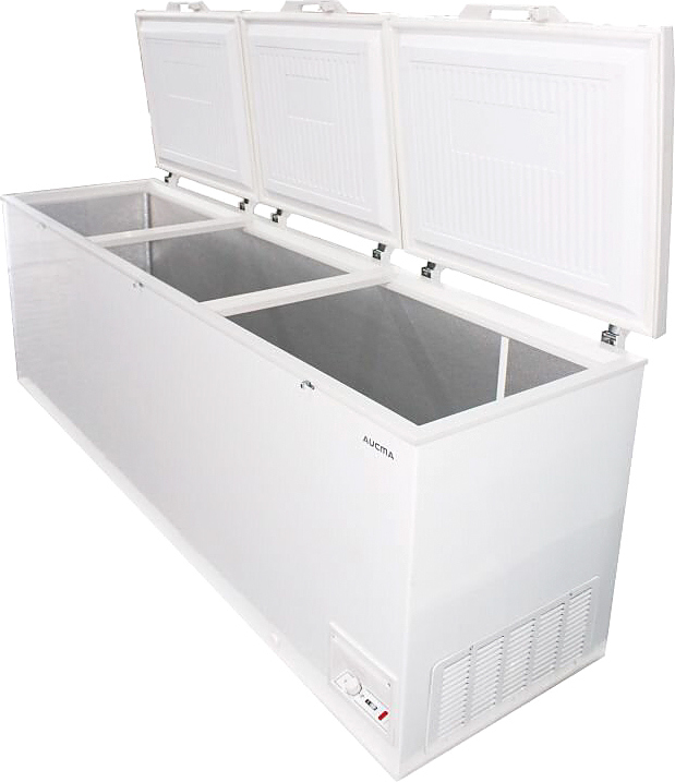 Морозильный ларь Aucma BD-818 является самым большим в линейке данного бренда, полезный объем аппарата составляет 742 литра, а для удобства крышка выполнена на три секции (три крышки).