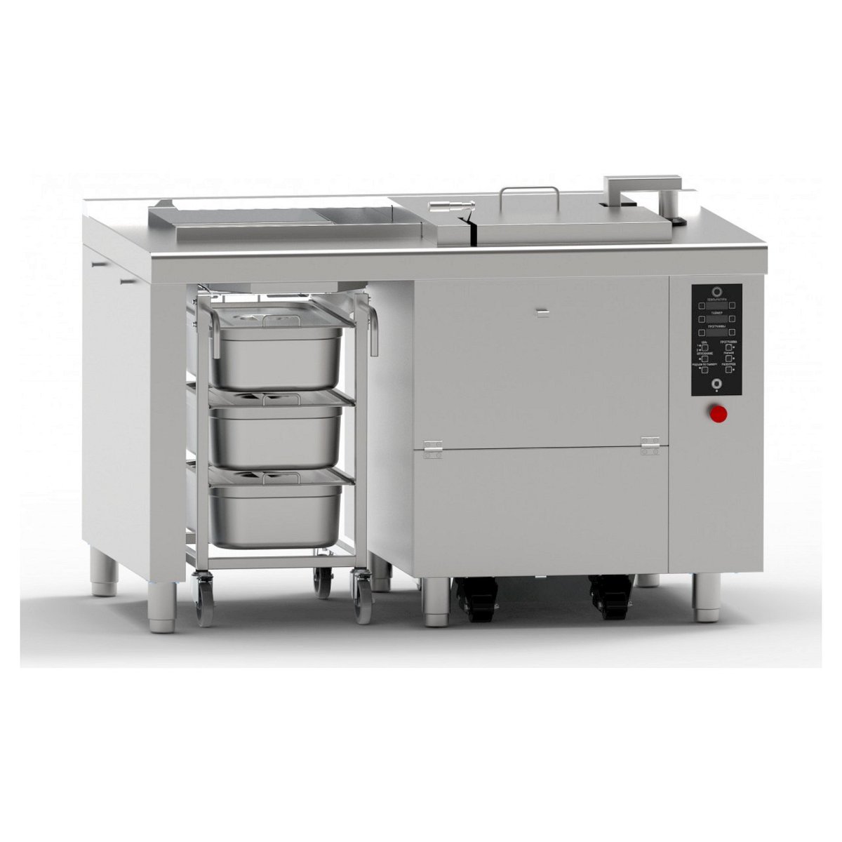 • Перфорированная корзина размером GN 1/1 с системой открытия днища, предохранительным стопором, изолированной ручкой на 4-х колесах из высококачественной нержавеющей стали
