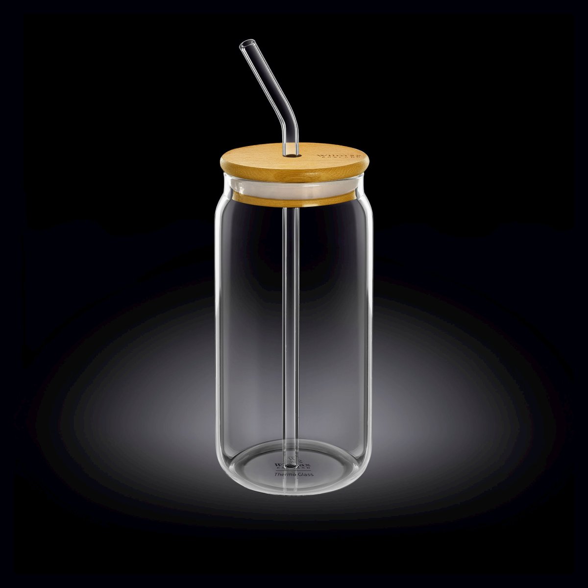 Банка для коктейля 500 мл. d=65 мм. h=160 мм с деревянной крышкой, с трубочкой Термостекло Wilmax /1/48/