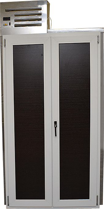 Комплектация с двустворчатым дверным проемом с белой рамой используется как складской вариант оборудования, стоящего отдельно от стойки розлива пива. В стенке камеры проделывают отверстие, через которое выпускают шланги до стойки.