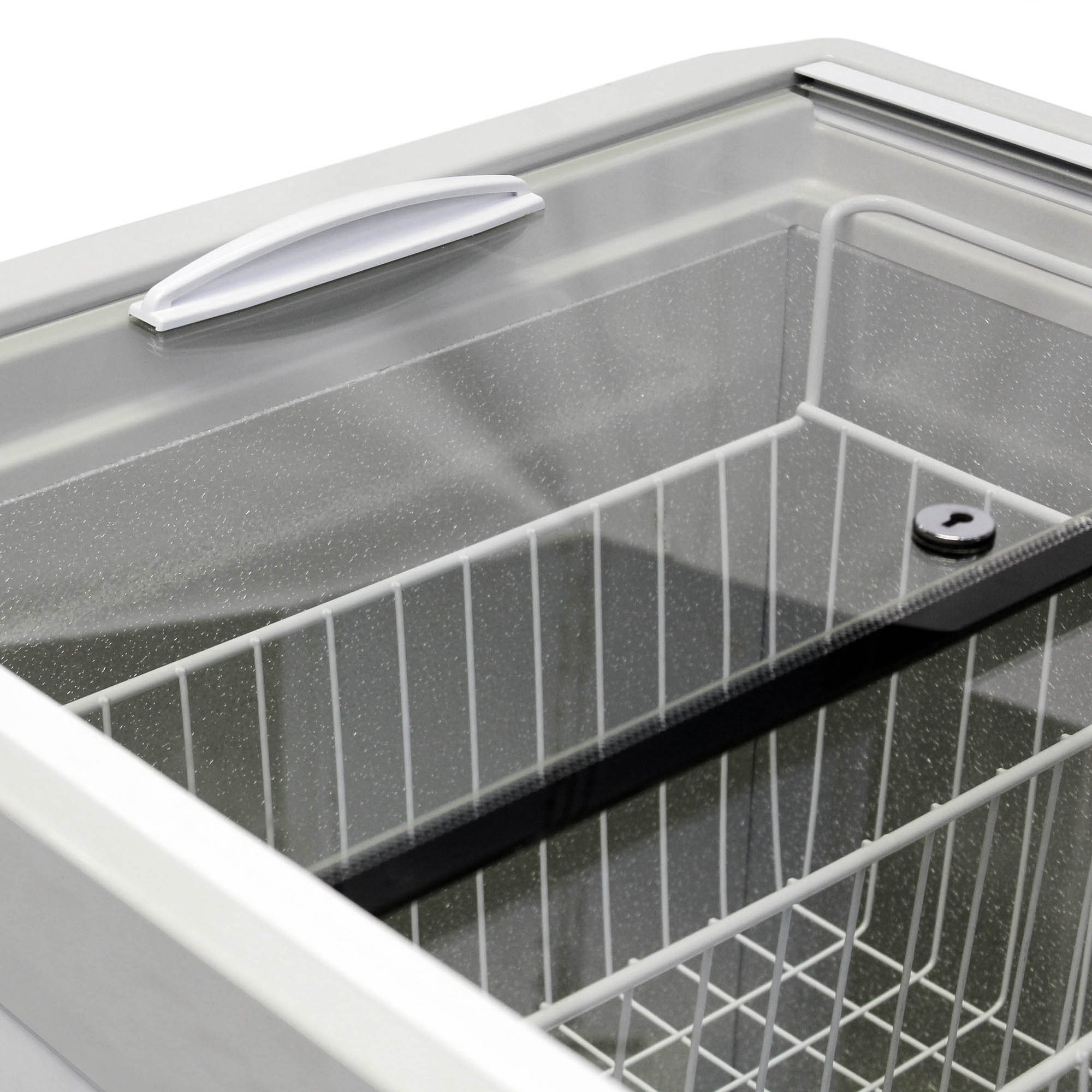 Морозильный ларь со стеклянной крышкой имеет закаленное стекло с теплоотражающим покрытием, защищающее от влияния внешних температур.