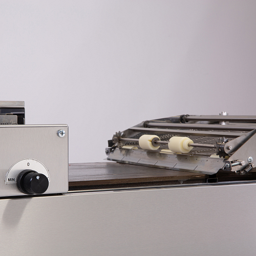 Регулировка зазора между кареткой и жарочной поверхностью позволяет изготавливать блины массой от 60г из теста разной плотности.