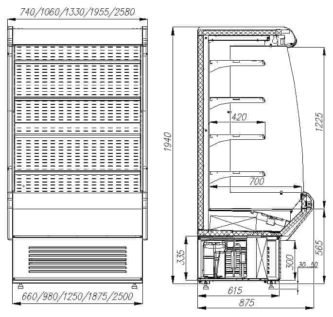 Горка холодильная Полюс Carboma F 20-08 VM 1,0-2 (ВХСп-1,0) используется на предприятиях общественного питания и торговли для охлаждения, кратковременного хранения, демонстрации и продажи напитков, мяса, птицы, колбасных, молочных и гастрономических изделий. Модель оснащена панорамным боковым остеклением, 4-мя полками c возможностью расположения под углом и изменения высоты, ночной шторкой и регулируемыми ножками высотой от 30 до 50 мм. Корпус выполнен из стали с ППУ изоляцией, внешние обшивки и полки из стали с полимерным покрытием серебристого цвета, боковины - из пластика.