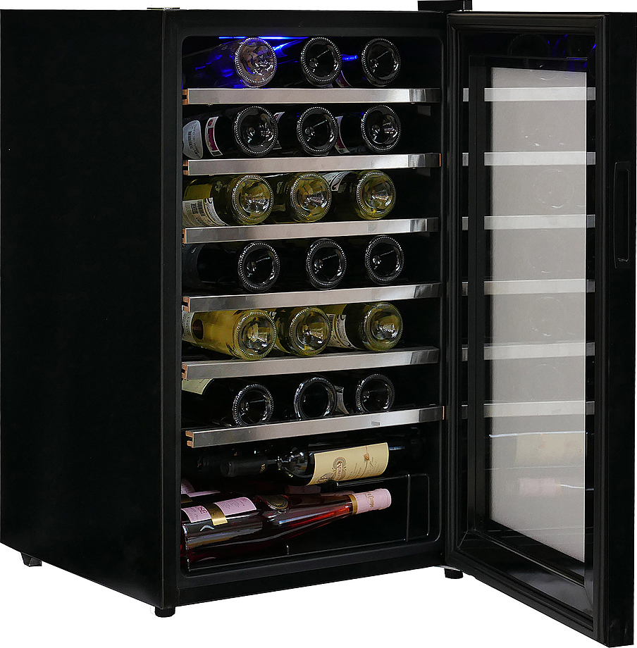 Элегантный дизайн холодильника для вина характеризуется как эргономичный и стильный, он имеет выдвижные металлические полки, которые облегчают размещение на них вина.