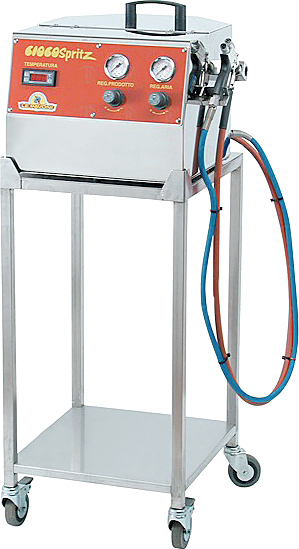 Машина Pavoni CHOCOSPRITZ предназначена для декорирования кондитерских изделий шоколадом и различными глазурями. Принцип действия: продукт под давлением подается из обогреваемого тёплым воздухом контейнера в пистолет. Для достижения различных видов декорирования применяется раздельная регулировка давления продукта и давления воздуха с помощью двух ручек на панели управления.