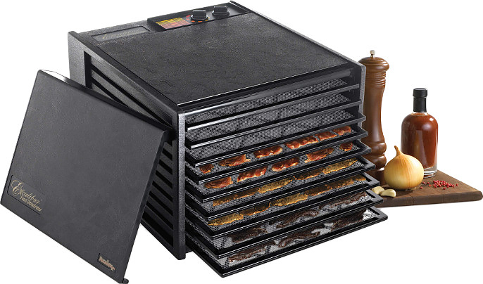 Дегидратор Excalibur 4926T220G предназначен для сушки овощей, фруктов, ягод, орехов, грибов и трав, расстойки теста, приготовления йогурта, сыра, вяления мяса и рыбы на предприятиях общественного питания и в домашних условиях. Модель оснащена расположенными в задней стенке нагревательным элементом и вентилятором, электронным термостатом, съемной дверцей и панелью управления с 2 поворотными регуляторами. Лотки выполнены из высококачественного поликарбоната без содержания бисфенола А (BPA).