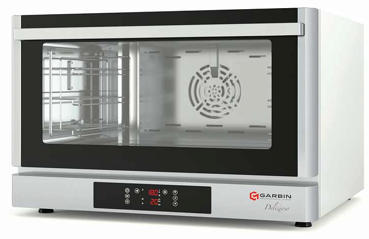 Печь конвекционная GARBIN DELIZIOSO-D с пароувлажнением на 3 уровня 600х400 или GN 1/1 (в комплекте 3 противня 600х400), электронная панель управления, регулируемое пароувлажнение, расстояние между уровнями 80 мм, 4,2 кВт, 380В, 61 кг, дверца открывается вниз