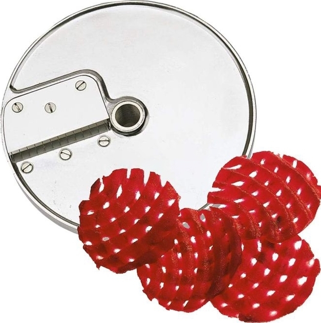 Диск нарезной Robot Coupe 28198 2мм гофрет применяется совместно с овощерезкой CL50 Gourmet для нарезки тонкими волнистыми ломтиками с дырочками гофры различных продуктов для приготовления закусок, салатов, десертов, первых и вторых блюд на предприятиях общественного питания и торговли.