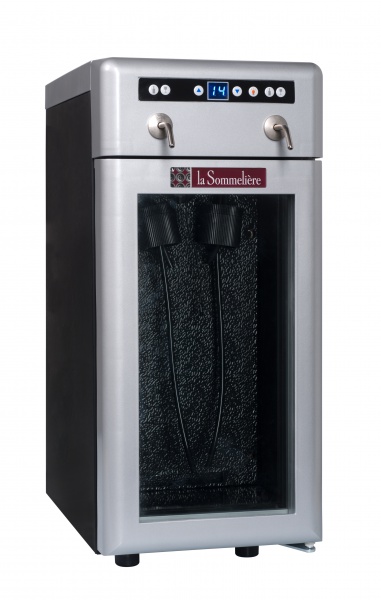 Диспенсер для вина La Sommeliere DVV22, это обновленная модель винного диспенсера DVV2, у новой модели появился датчик давления в баллоне с азотом. С помощью давления подаваемого от баллона с азотом происходит разлив вина по бокалам и при этом вино оставшееся в бутылке не портится. Диспенсер модернизирован на отечественные баллоны с пищевым азотом из-за отсутствия сертифицированных поставок сменных баллонов от производителя. Приобрести обычный баллон с азотом на 5 л. в России гораздо проще и цена в разы ниже, а 5 л. баллона вам хватит на 6-12 месяцев в зависимости от эксплуатации. Охлаждение компрессорное и температура легко настраивается на электронном контроллере управления с индикацией температуры. Установить сразу можно две бутылки вина объемом 0,75 л. Это отличное решение для заведений, где устраиваются дегустации или продают вино по бокалам.