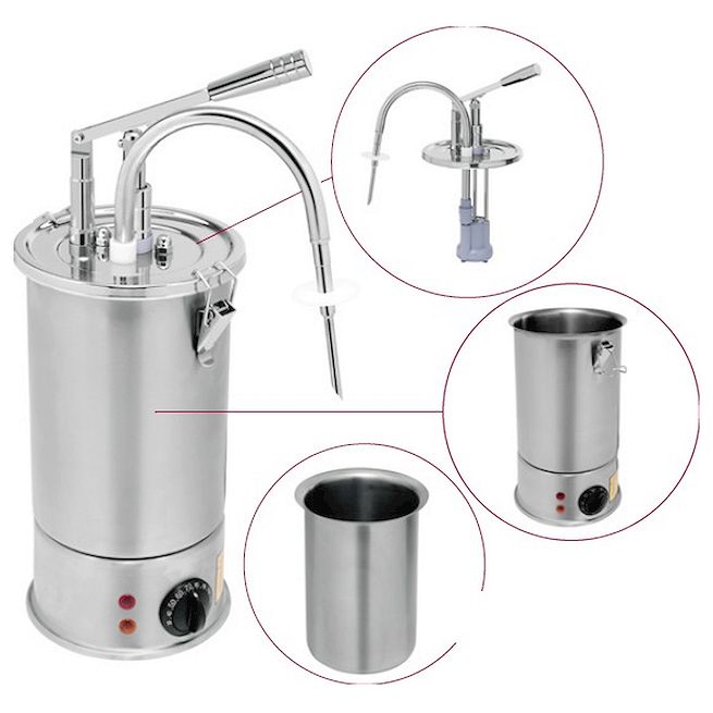 Дозатор начинки Kalando KD1750 используется на предприятиях общественного питания и торговли, в частных домах и квартирах для наполнения кондитерских изделий горячими начинками из шоколада, меда, джема или заварного крема. Изделие оснащено механическим термостатом для установки температуры соуса, световыми индикаторами нагрева и подключения к сети и защелками для крепления крышки. Рычаг, игла и емкость для соуса выполнены из нержавеющей стали.