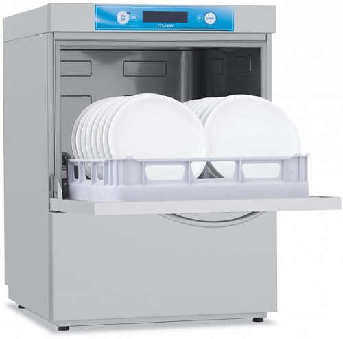 Фронтальная посудомоечная машина Elettrobar RIVER 63TDE со встроенным водоумягчителем непрерывного действия используется для мытья стаканов и столовых приборов на профессиональных кухнях и других предприятиях общественного питания.