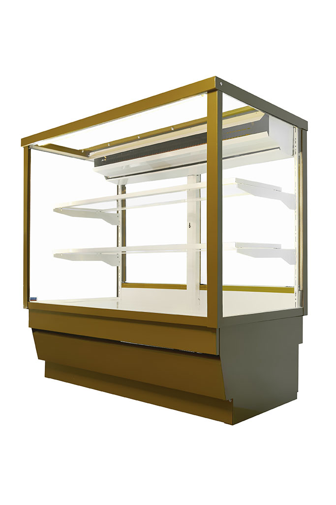 Модель оснащена 2 полками, основанием и раздвижными дверями со стороны продавца. Внутренние детали витрины окрашены в белый цвет. Корпус выполнен из стали, полки - из стекла.