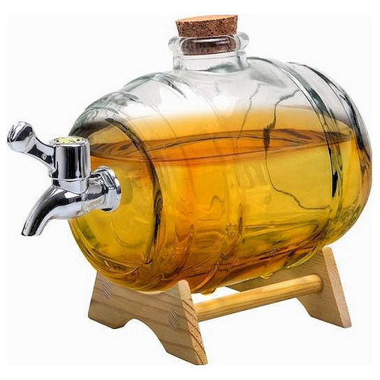 Он имеет идеально расположенный кран, натуральную пробковую пробку и деревянную подставку.