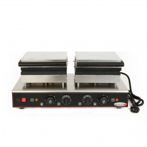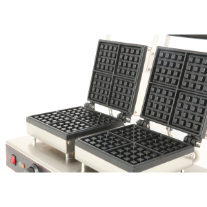 Вафельница электрическая настольная с электромеханическим управлением имеет 2 квадратные рабочие поверхности, каждая из которых разделена на 4 сегмента для выпечки бельгийских вафель; 4 ножки.