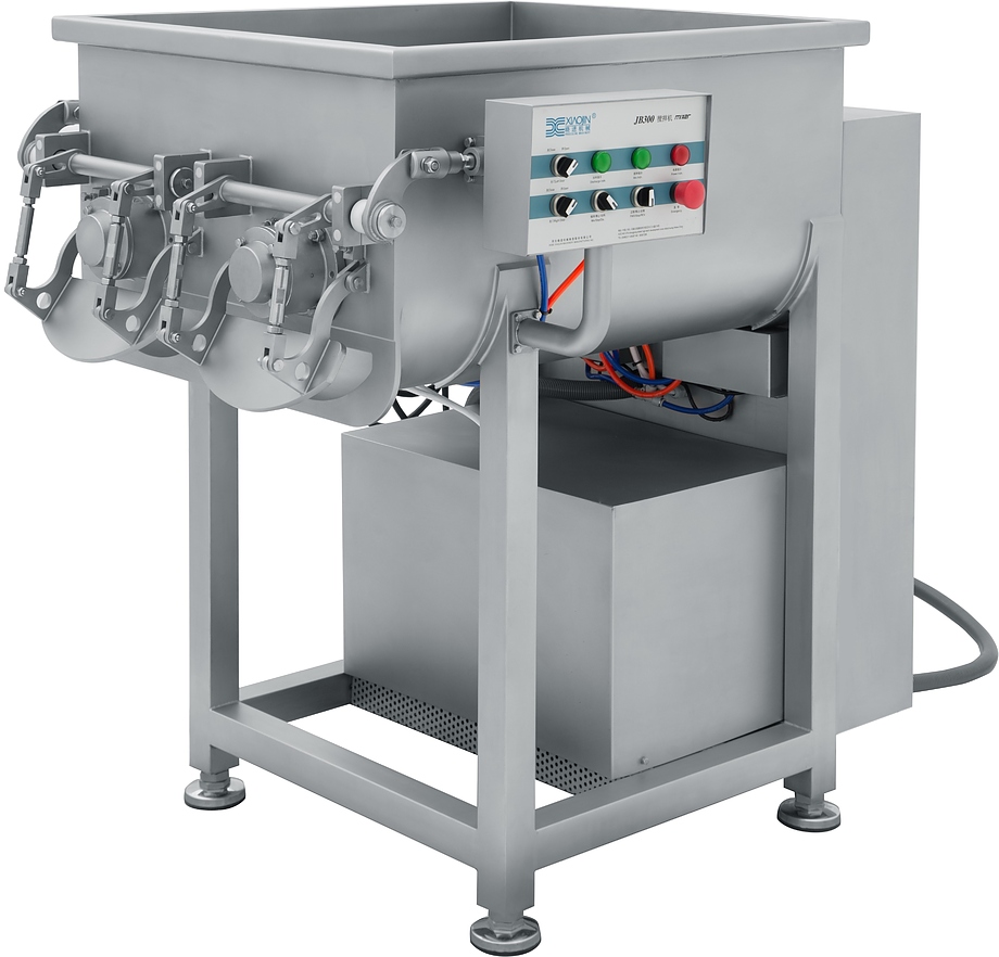Фаршемес открытого типа Hualian Machinery JB-300 – еще одна модель серии промышленных фаршемесов открытого типа с месильным органом в форме лопастного шнека. Данная модель оснащена двумя шнеками, автономно управляемыми при помощи двух мотор-редукторов. Емкость дежи – 300 л, разовая загрузка сырья – 220-265 кг.