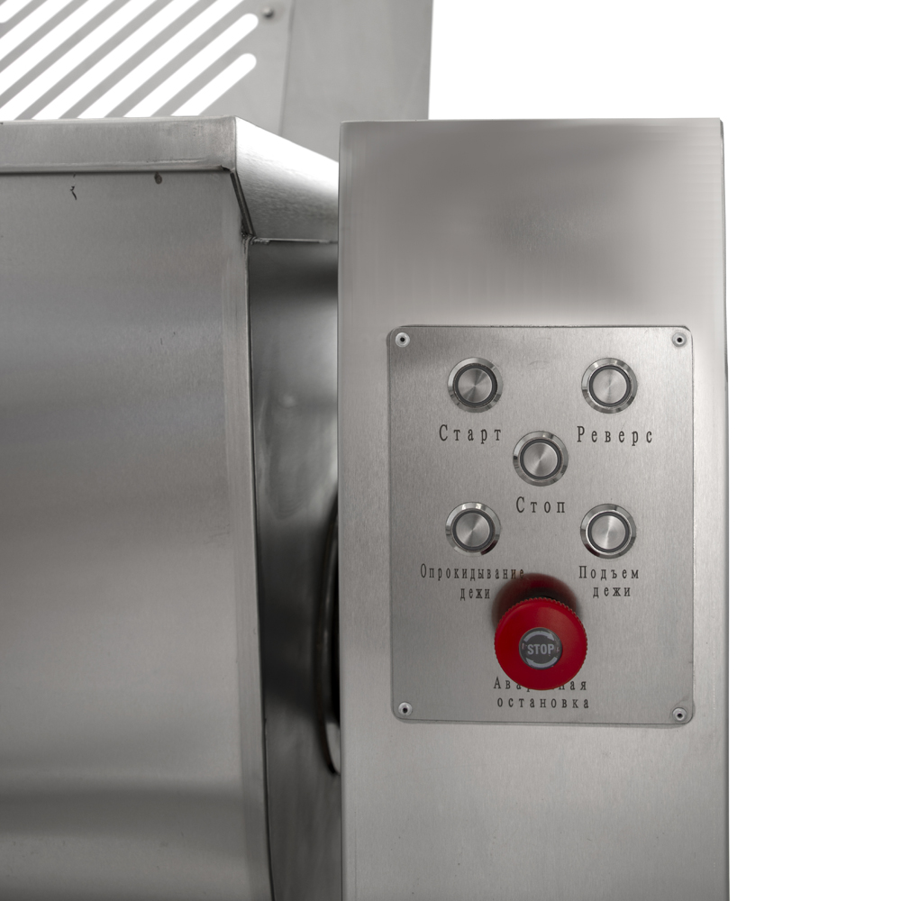 Модель оснащена электродвигателем, опрокидывающейся дежей, смотровым окном и опорными ножками. Все детали, контактирующие с продуктами, выполнены из нержавеющей стали, крышка - из оргстекла.
