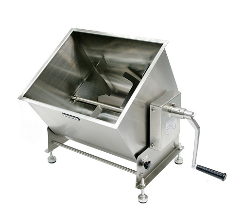 Модель оснащена ручным приводом, хабом для подключения электрического привода и откидным бункером. Корпус выполнен из нержавеющей стали, съемная ось с лопастями - из нержавеющей стали толщиной 3 мм, емкость для смешивания - из нержавеющей стали толщиной 2 мм.