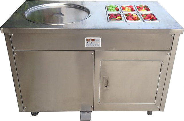 Фризер имеет охлаждаемую круглую поверхность, на которую наливается заранее приготовленная жидкая смесь для мороженого.