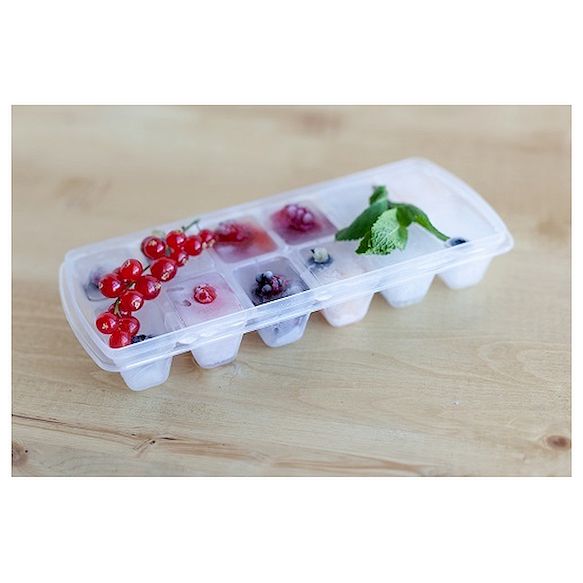 Форма для льда имеет 12 одинаковых ячеек, которые после наливания воды закрываются эластичной крышкой: она предотвращает протекание жидкости и попадание внутрь посторонних запахов.