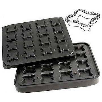 Форма для тарталетницы H предназначена для производства тарталеток для машины COOKMATIC и представляет собой две пластины, одна из которых имеет выемки, а вторая выпуклости. Пластина с выемками крепится к неподвижной станине машины, а вторая к верхней подвижной части. Пластины покрыты тефлоном. Включает 25 форм "звезда" с фестонами, размером 64x64 мм.