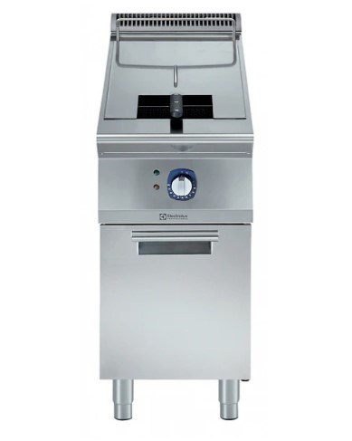 Фритюрница 900сер ELECTROLUX E9FRED1GF0 391087 оснащена 1 ванной на 15л, 1 корзиной, наружными нагревательными элементами. Фритюрница имеет штамповнную ванну V-образного профиля, где электронагревательные элементы расположены с наружной стороны ванны. Встроенная система слива позволяет собрать отработанное масло в приемным бак, расположенный в нижней части фритюрницы.