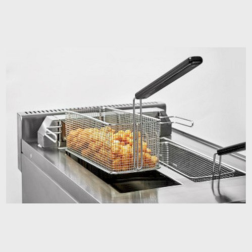 Две ванны, вместимостью по 11 литров каждая, имеют раздельную плавную регулировку температуры. Рабочий диапазон – от 50 до 200 °С. Подставка фритюрницы электрической оснащена специальными направляющими для установки гастроемкости, которая используется при сливе масла через кран, установленный под ванной.