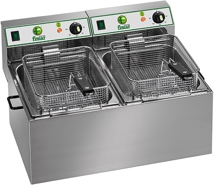 Фритюрница FIMAR FT88 предназначена для приготовления блюд в глубоком слое масла. Оснащена регулятором температуры, предохранительным термостатом с кнопкой возврата в исходное состояние и съёмным верхним блоком. Для независимого использования каждая ванна оборудована собственным термостатом. Корпус, ванны, крышки и ТЭНы изготовлены из нержавеющей стали, выдвижные корзины – из хромированной проволоки, ручки корзин и крышек – из термоизолирующего пластика.