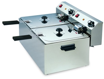 Фритюрница GASTRORAG CZG-80-2 мощностью 2x3250 Вт (2 кабеля питания) - это техника для профессиональной кухни, предназначенная для быстрой жарки в глубоком слое масла блюд из овощей, морепродуктов, мяса, рыбы. Продукты, погруженные в горячий фритюр, моментально покрываются хрустящей корочкой, которая защищает их от пересыхания и поглощения излишнего жира. Настольная электрофритюрница оснащена двумя съемными чашами большого объема (8 л) из нержавеющей стали, двумя крышками и двумя полноразмерными корзинами, в каждую из которых можно загрузить до 1600 г продукта. Фритюрный шкаф имеет простое электромеханическое управление, температура масла в каждой чаше плавно регулируется в диапазоне 110-190оС при помощи ручки термостата. Защитный термостат отключает электропитание в случае перегрева. Если это произошло, то нужно дать устройству остыть и взвести защитный термостат при помощи кнопки, расположенной в нижней части блока управления. Корпус фритюрницы изготовлен из нержавеющей стали.