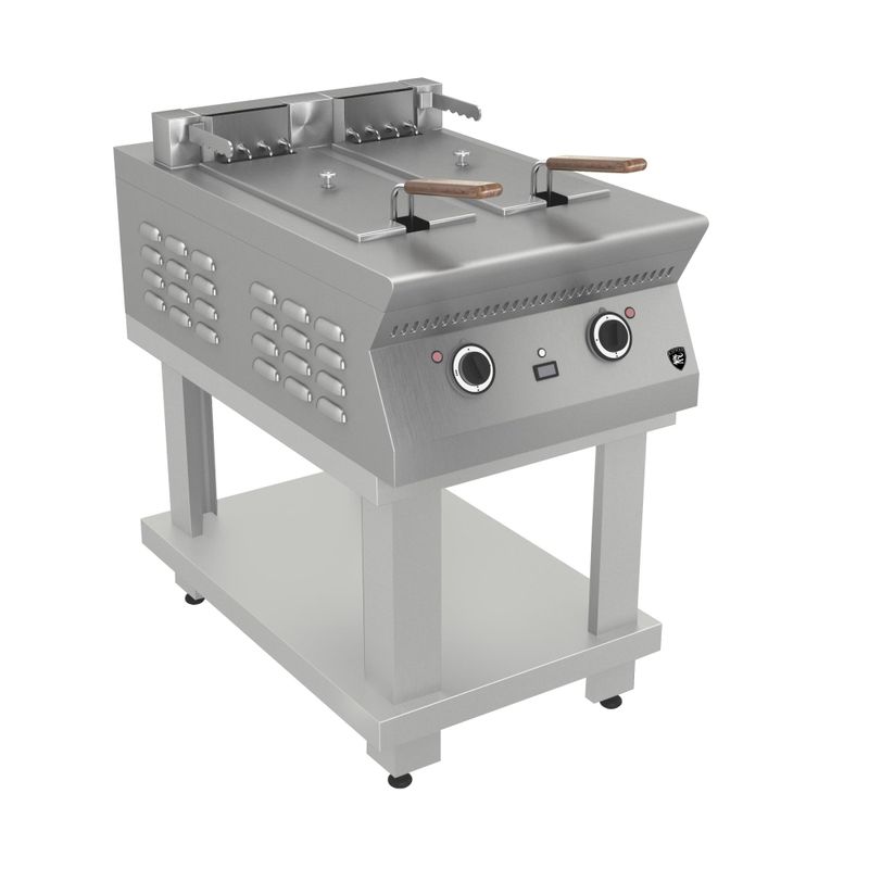 2шт. фритюрных корзины по 400*150*130мм . Макс. загрузка 2*1,0=2,0кг. Объем масла, заливаемого в ванну 2*16,3=32,6л, диапазон регулирования рабочей температуры масла в ванне 20-190С, время разогрева до рабочей температуры 20мин ,