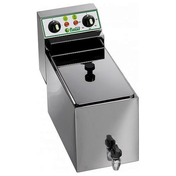 Фритюрница FIMAR FR8R предназначена для приготовления блюд в глубоком слое масла. Оснащена регулятором температуры, предохранительным термостатом с кнопкой возврата в исходное состояние, предохранительными кранами и съёмным верхним блоком. Корпус, ванна, крышка и ТЭНы изготовлены из нержавеющей стали, выдвижная корзина – из хромированной проволоки, ручки корзины и крышки – из термоизолирующего пластика.
