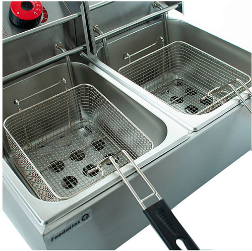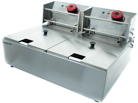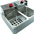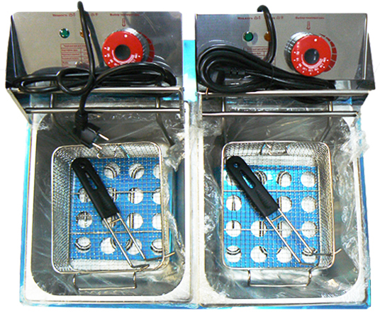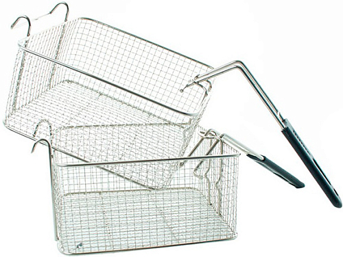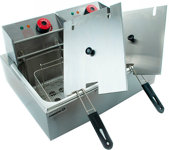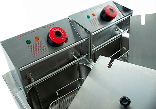 Электрическая фритюрница оснащена механическим управлением, световыми индикаторами и двумя проволочными корзинами.