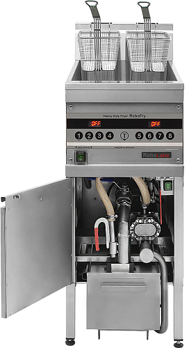 Фритюрница RoboLabs RoboFry RF2 предназначена для приготовления различных продуктов в большом количестве масла на предприятиях общественного питания и торговли. Модель оснащена электронной программируемой панелью управления, механизмом поднятия ТЭНов, системой фильтрации масла и закрытой подставкой. Конструкция изготовлена из нержавеющей стали AISI 430.