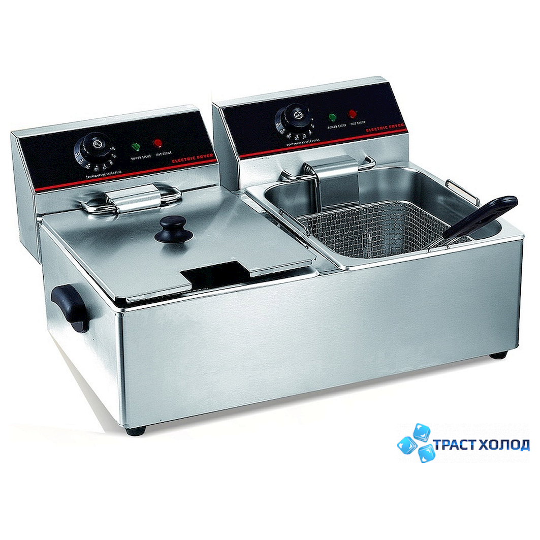 Имеется две рабочие ванны вместимостью восемь литров каждая. В комплект оборудования входят две корзины для приготовления пищи и два силовых кабеля (на 3,25 киловатт). Требуемый режим работы устанавливается при помощи регулятора, удобная крышка исключает разбрызгивание жира.