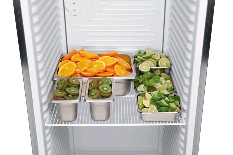 Корпус изготовлен из высококачественной нержавеющей стали, материал обладающих отличными показателями по практичности и способностью сочетаться со всеми интерьерами. Имеется возможность при желании перевесить дверцу на противоположную сторону, посредством предустановленных элементов крепления в конструктиве оборудования. Электронная панель управления с цифровым индикатором температуры в верхней части холодильного шкафа позволит регулировать и устанавливать необходимую температуру.