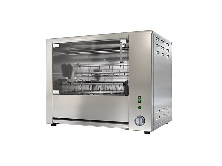 Корпус гриля изготовлен из пищевой нержавеющей стали AISI430. Гриль карусельного типа загрузкой до 8 кур. Куры размещаются внутри гриля на четырех легкосъемных садках (люльках), изготовленных из нержавеющего прутка. Садки вращаются вокруг центральной оси внутри рабочей камеры. Механизм торможения позволяет четко фиксировать положение садков во время остановки вращения, исключая проворот при несимметричной загрузке. Приготовление продуктов осуществляется посредством инфракрасного излучения ТЭНов, расположенных на передней, задней и верхней частях рабочей камеры. Каждый ТЭН имеет отражатель, повышающий эффективность нагрева продукта. Интенсивность нагрева плавно регулируется терморегулятором, ручка которого расположена на передней панели гриля. На дне рабочей камеры расположен поддон для сбора влаги и жира, стекающего с кур. Дверь, выполненная из закаленного стекла, позволяет наблюдать за процессом приготовления. В закрытом положении дверь фиксируется магнитной защелкой. Угол и положение открытой двери не препятствуют выемке садков с курами. В гриле можно приготовить не только целые тушки кур, но и отдельные части: крылышки, бедра, грудки.
