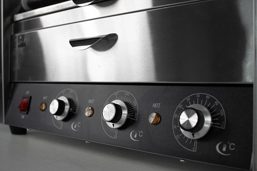 Имеет прозрачный колпак с крышкой, что позволяет поддерживать заданную температуру сосисок.