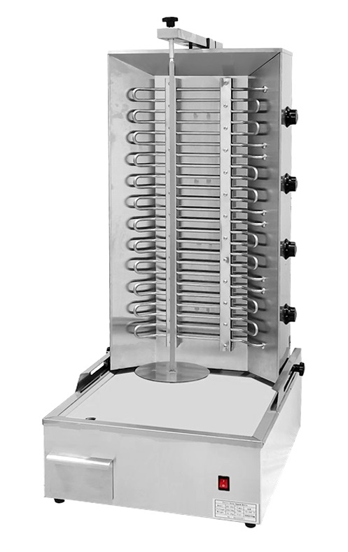 Гриль для шаурмы Kocateq GH 8DKE электрический с загрузкой до 80 кг мяса предназначен для обжарки большого количества различных видов мяса и птицы при приготовлении начинки для шаурмы, донера и других блюд на предприятиях общественного питания и торговли. Размещение на вертикальном вертеле обеспечивает равномерное приготовление. Модель оснащена 4 зонами нагрева с индивидуальной регулировкой, электроприводом вращения спицы и съемным лотком для сбора жира. Корпус выполнен из нержавеющей стали AISI 201, которая отличается прочностью и долговечностью.